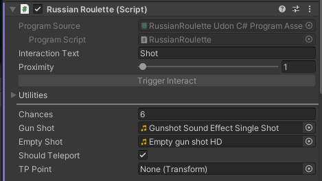 Russian Roulette prefab, configurable chances, sounds and optional teleport.